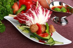 Ugotuj bulionetkę KNORR w 100ml wody i wystudź. Mięso mielone wymieszaj w jajkiem, startą marchewką i bulionetką. Dopraw w razie konieczności. Formuj małe kulki – dzieci na pewno chętnie zrobią to za Ciebie. Razem z dzieckiem panieruj kulki w bułce tartej i smaż na patelni, aż nabiorą rumianego koloru. Odstaw na ręczniku papierowym. Kulki można również opiec w piekarniku bez użycia tłuszczu. Niech dziecko za pomocą plastikowego noża pokroi paprykę w dużą kostkę. Razem z maluchem nadziewaj na patyczki na przemian mięsne kulki i paprykę. Uważaj, aby mięso było już odpowiednio wystudzone. Piecz w piekarniku rozgrzanym do 160 stopni przez ok. 10min. Podawaj np. z Fixem KNORR Danie na dziś Spaghetti Bolognese. Potrawę udekoruj wachlarzykami z ogórka. Ogórka przekrój wzdłuż na pół. Następnie krój w plastry, docinając do końca np. co trzeci, lub co piąty plasterek. Rozkładaj jak wachlarzyk.